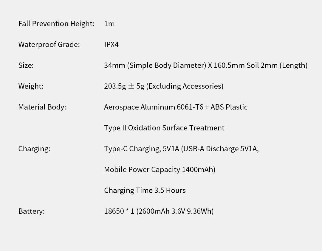 1 x 18650 (2600mAh 3.6V 9.36Wh) (Built-in)