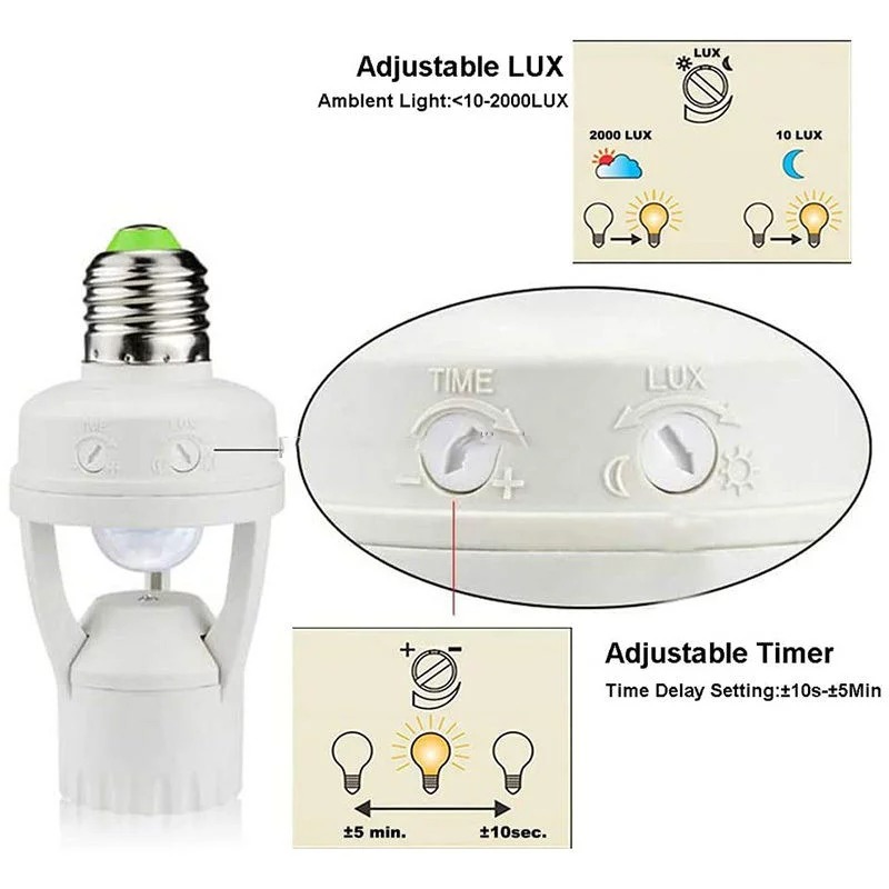 - -Light Activation Once motion is detected in a low-light environment (below the set Lux threshold), the lamp holder automatically switches the connected bulb ON.