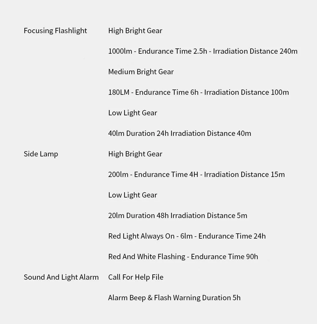 The main lamp focus is 1000lm highlight, 3 kinds of gears, highlight-medium-low brightness, side light 4 kinds of gears, highlight-low brightness-red light always on- red and white flashing.
